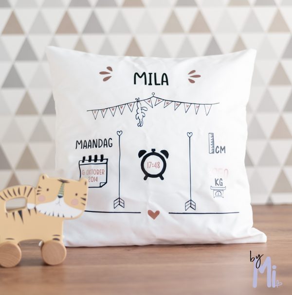Opzoek naar een leuk kraamcadeautje? Onze geboortekussen “Mila” is een uniek ontwerp en door ons zelf ontworpen en getekend.