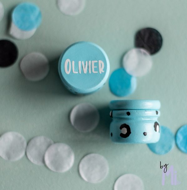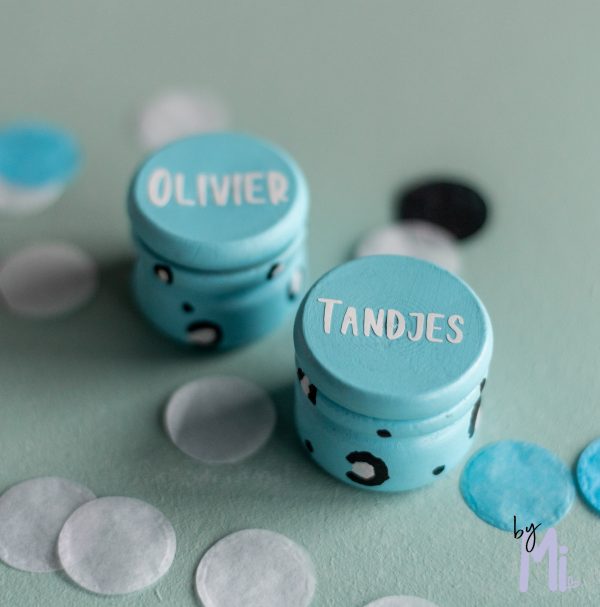 Leuke gepersonaliseerde tandendoosje voor het bewaren van de tandjes van je kindje. De diameter is 4cm en het tandendoosje is ongeveer 3cm hoog.