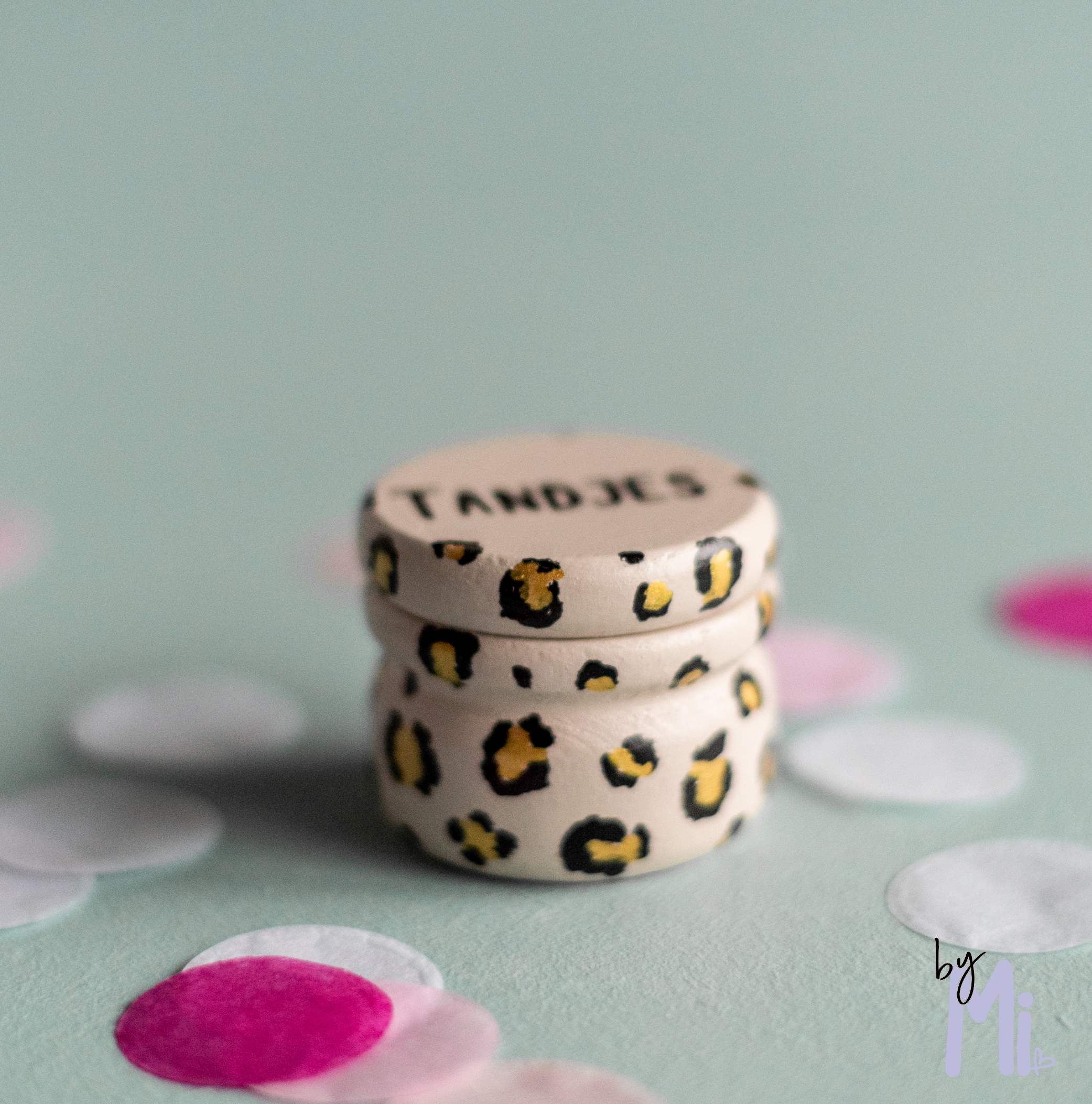 De afmeting van het tandendoosje is 4 diameter en 3 cm hoog en voorzien van een luipaard print. Het materiaal van het tandendoosje is hout en voorzien van een schroefdop.