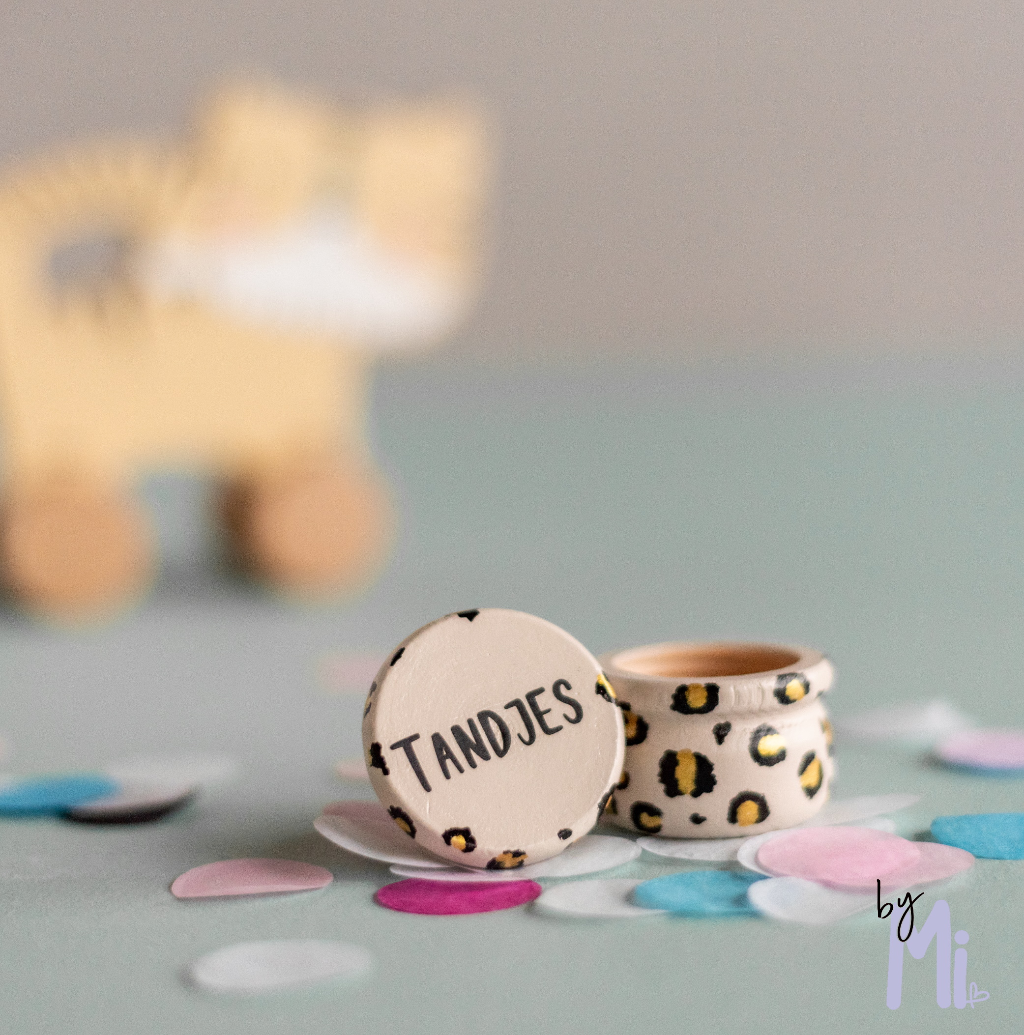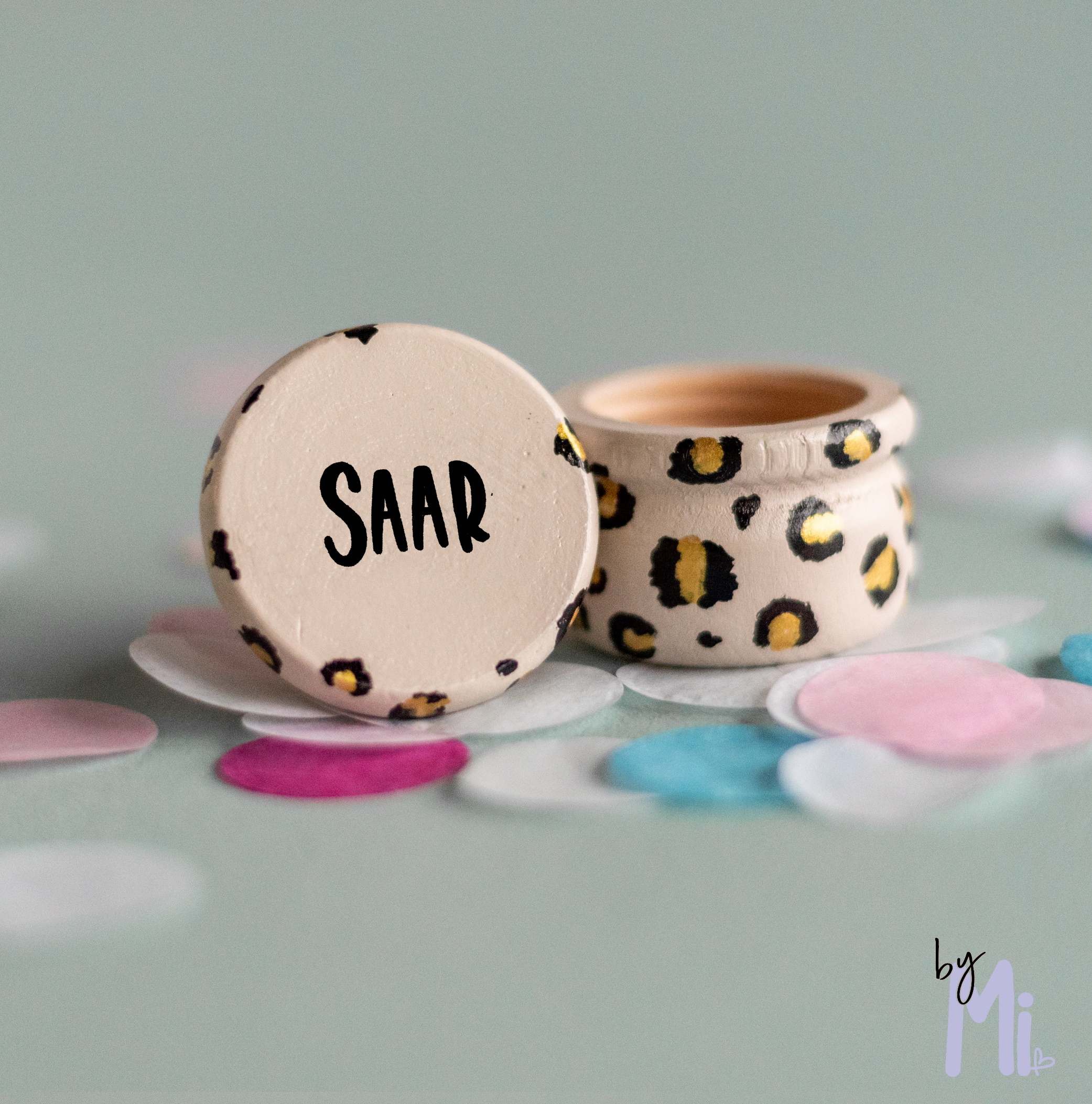 Leuke gepersonaliseerde tandendoosje luipaard creme voor het bewaren van de tandjes van je kindje. De diameter is 4cm en het tandendoosje luipaard creme is ongeveer 3cm hoog. Een uniek schattig cadeau voor het bewaren van de tanden van je kindje! Ook leuk om te geven als kraamcadeautje. Het tandendoosje is door ons zelf ontworpen en met de handgeschilderd. Geef de naam door van je kindje en wij plakken met vinyl de gewenste naam erop. De kleur van de opdruk is zwart. De afmeting van het tandendoosje is 4 diameter en 3 cm hoog en voorzien van een camouflage print. Het materiaal van het tandendoosje is hout en voorzien van een schroefdop. De tandendoosje is voor de sier en mogen niet in de mond komen van “kleine” kinderen.